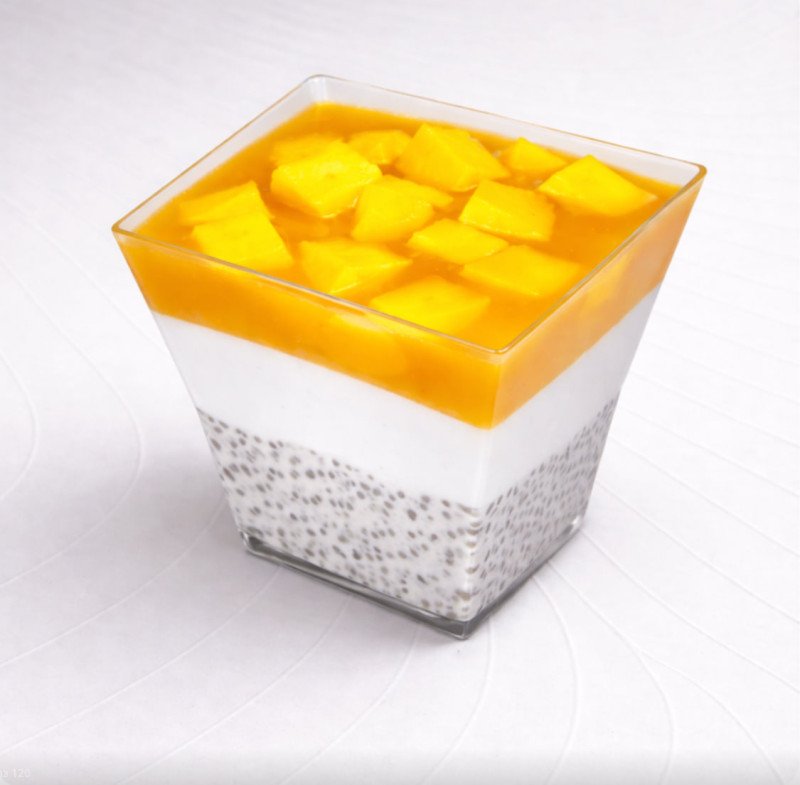 Сочетание пюре из тропических фруктов с кокосовым соусом, семенами чиа и кусочками манго
