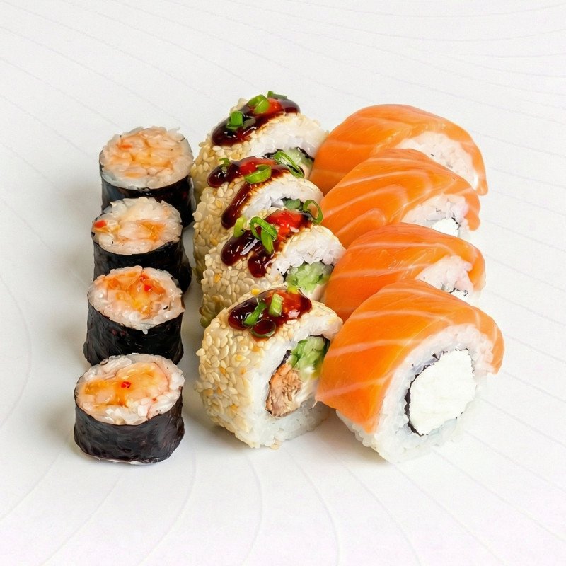 Ролл Филадельфия, ролл Шрирача, ролл Маки креветка