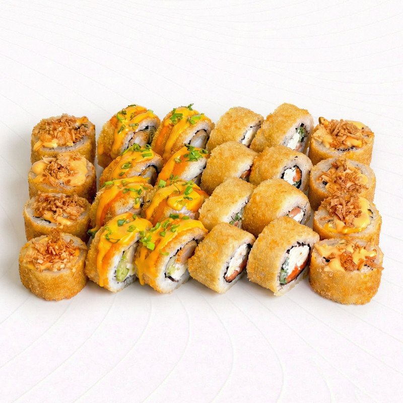 Ролл Темпура Креветка Чеддер, ролл Темпура с лососем, ролл Темпура с терияки-лососем и луком фри