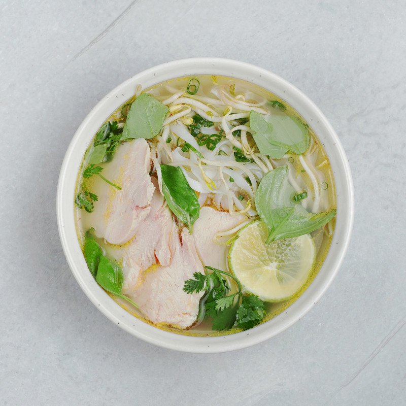 Пряный бульон Фо, курица, пшеничная лапша, дайкон. Подается с зеленым луком и лаймом.