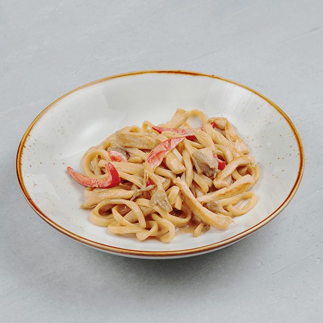 Удон с курицей грибами в фирменном сливочном соусе421 гЛапша удон с курицей, перцем болгарским и шампиньонами в сливочном соусе