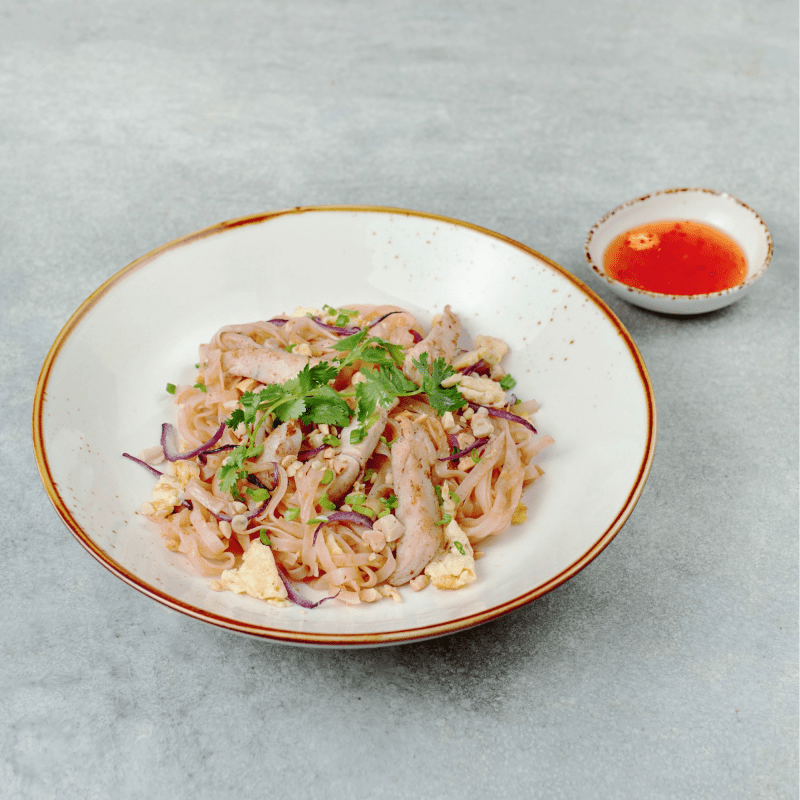 Пад тай с курицей436 гЛапша пшеничная с курицей и овощами в соусе Пад Тай. Подается с кинзой, лаймом и арахисом.