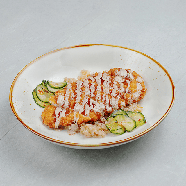 Цыпленок Кацу с рисом и огурцами425 гКуриное филе в хрустящей темпуре на ароматном рисе в сочетании с огурцами Кимчи, ореховым соусом и соусом Черный перец