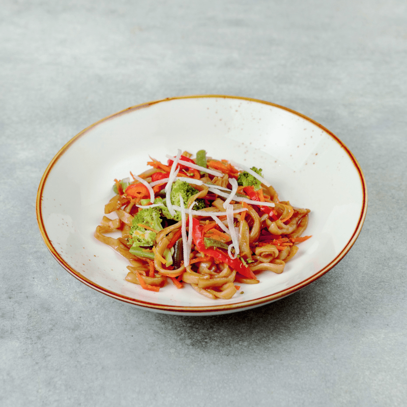 Удон с овощами с соусом на выбор:340 гЛапша удон с миксом овощей: хрустящая морковь, перец болгарский, фасоль стручковая, брокколи, дайкон. Посыпается кунжутом.