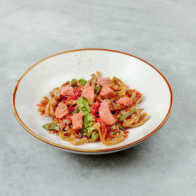Удон с лососем и овощами с соусом на выбор:377 гЛапша удон с лососем и миксом овощей: морковь, перец болгарский, фасоль стручковая, брокколи.
