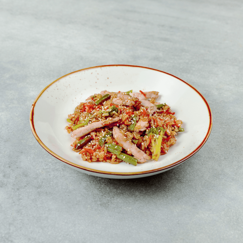 Рис с курицей и овощами с соусом на выбор:353 гРис с курицей и миксом овощей: хрустящая морковь, перец болгарский, брокколи и стручковая фасоль