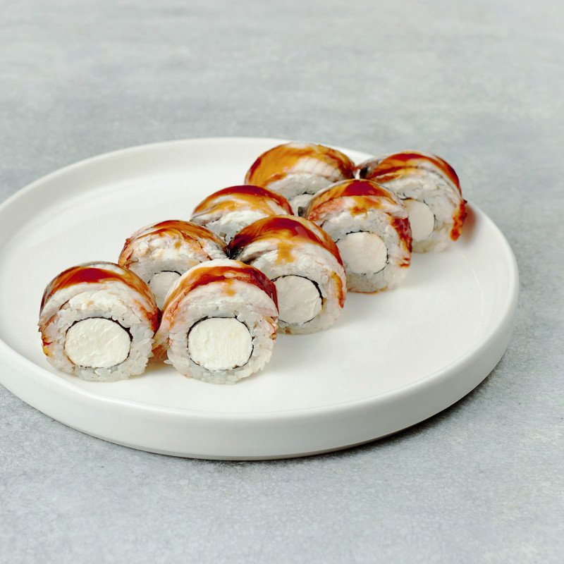 Вариант классического ролла с угрём и сливочным сыром в сочетании со сладким соусом унаги.