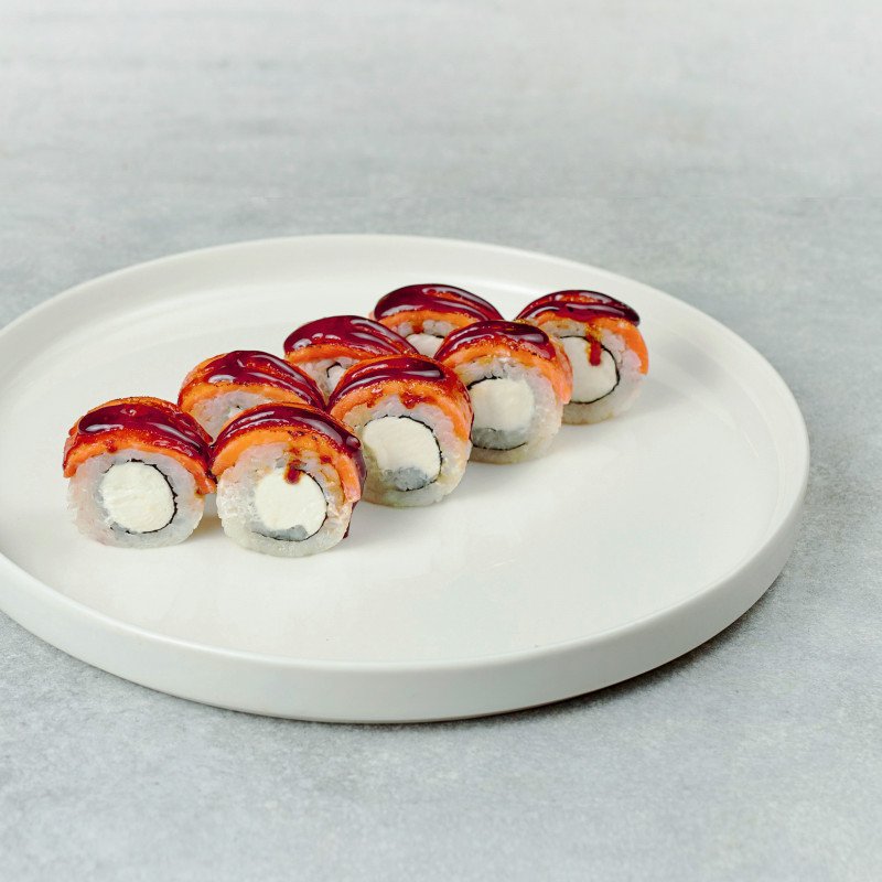 Любимая Филадельфия со сладкой ноткой. Вкус лосося, сливочного сыра, дополняется карамельной корочкой и соусом Унаги