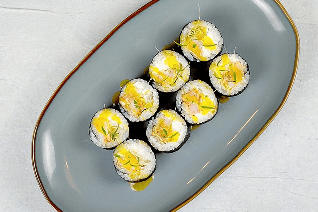 Сочетание тигровой креветки в темпуре с нежным сливочным сыром и хрустящим листом салата под пикантным соусом Чили-юдзу.