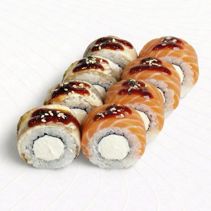 Когда хочется два в одном. Нежный лосось и ароматный угорь, сливочный сыр в сочетании с соусом Унаги и кунжутом