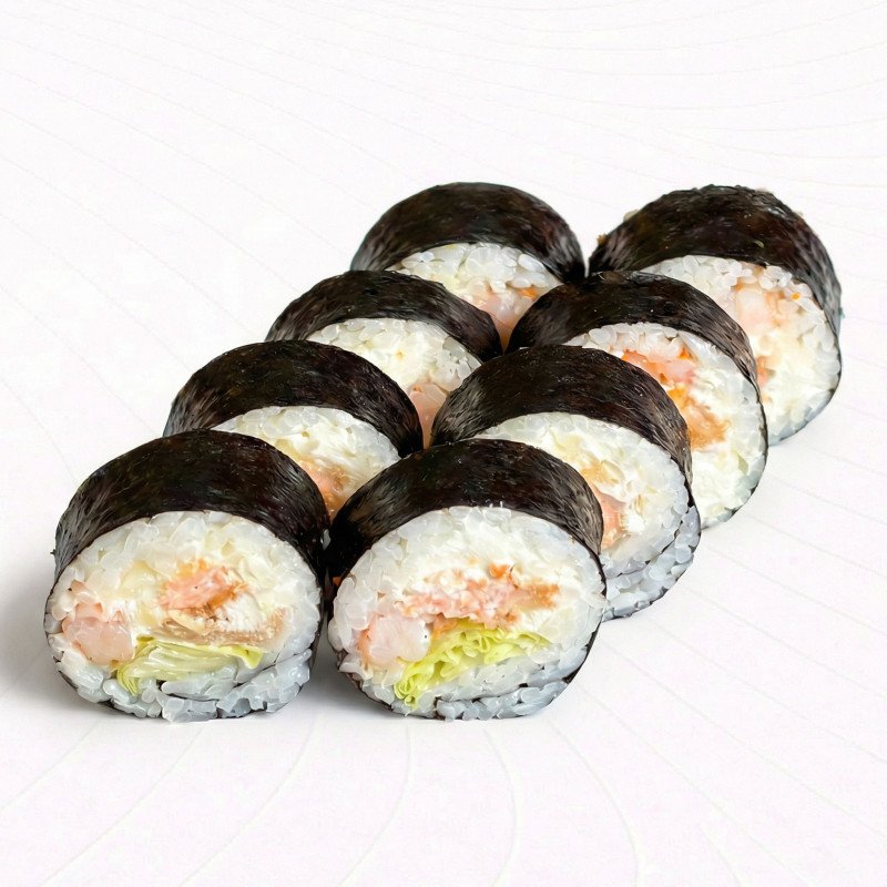 Лосось в темпуре и тигровые креветки в сочетании со сливочным сыром и хрустящим салатом Айсберг
