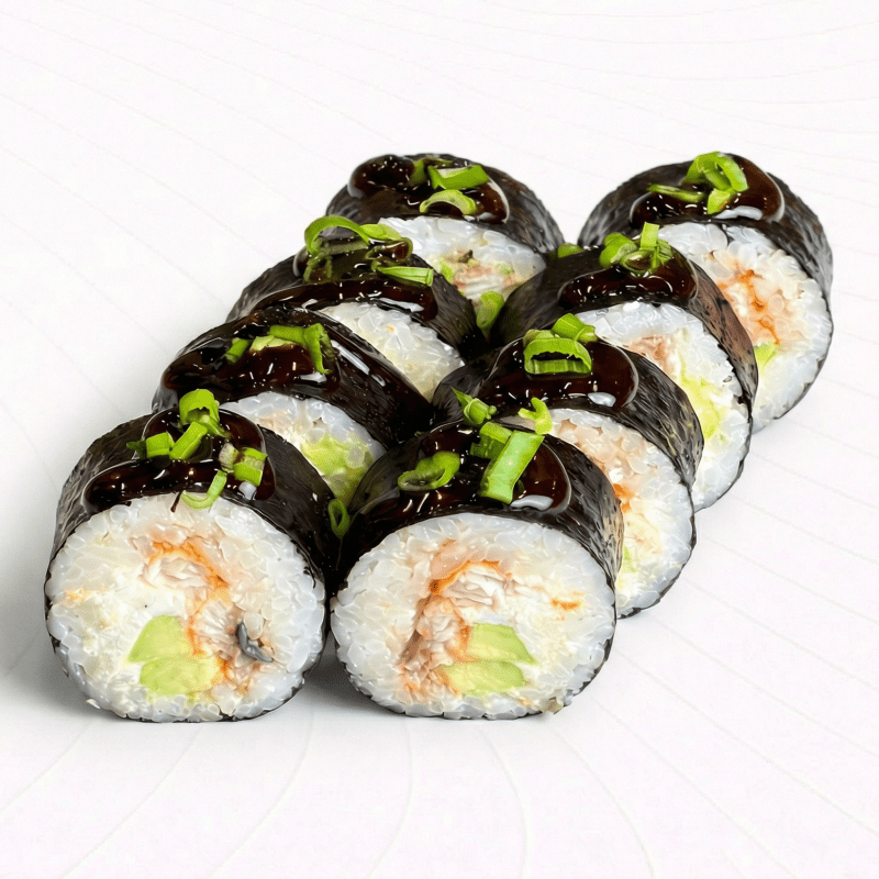 Угорь в сочетании со сливочным сыром и авокадо под соусом Унаги с зеленым луком на ваш выбор классический вариант, запеченный под фирменной шапочкой или в хрустящей темпуре