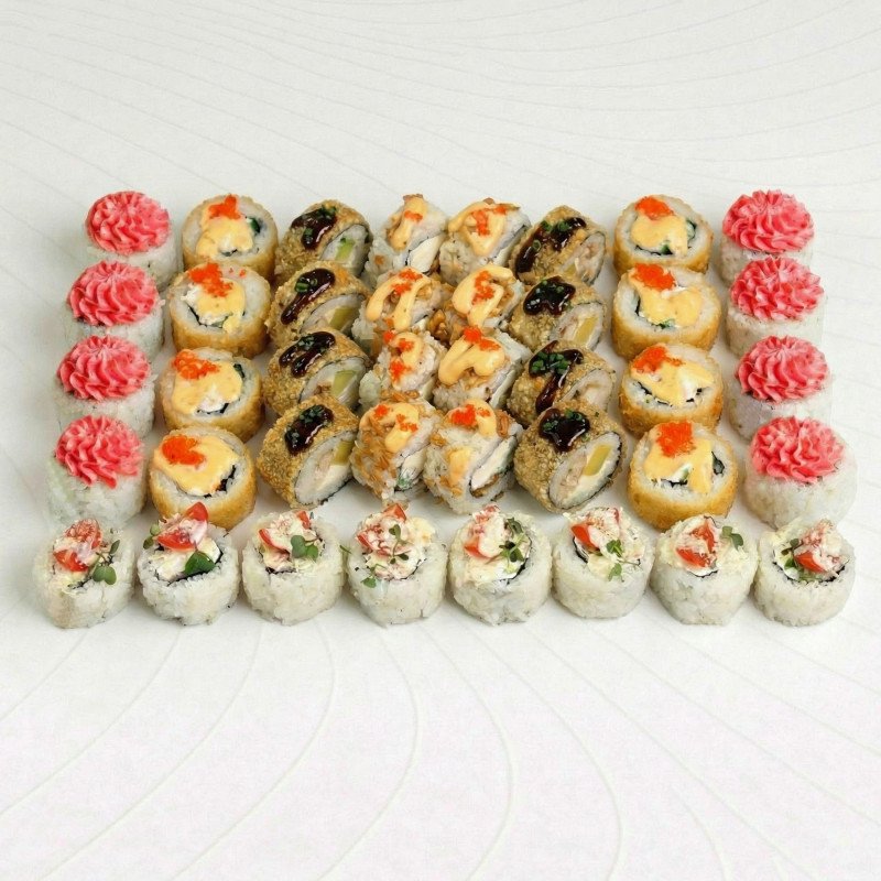 Ролл Лосось онион, ролл Темпура с угрем и авокадо, ролл Лава с крабом, ролл Калифорния темпура, ролл Цезарь с курицей