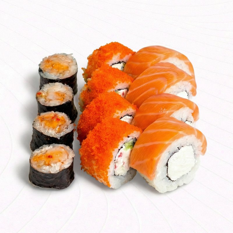 Ролл Филадельфия, ролл Маки креветка, ролл Калифорния со снежным крабом