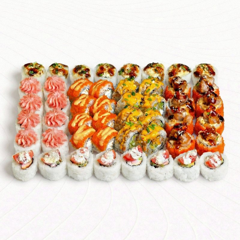 Ролл Чиз с курицей, ролл Лава с лососем, ролл Калифорния со снежным крабом, ролл Цезарь с курицей, ролл Запеченный Эби, ролл Запеченный краб в тобико