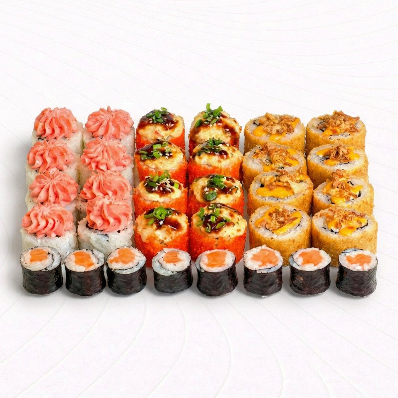 Ролл Запеченный терияки лосось в тобико, Ролл Темпура с терияки-лососем и луком фри, ролл Маки с лососем, ролл Лава с лососем