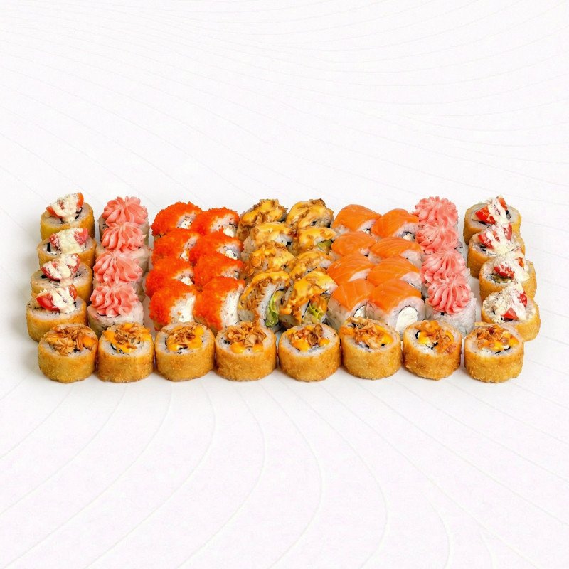Ролл Филадельфия лайт, ролл Креветка онион, ролл Фила Масаго, ролл Лава с лососем, ролл Цезарь темпура с курицей, ролл Темпура с терияки-лососем и луком фри