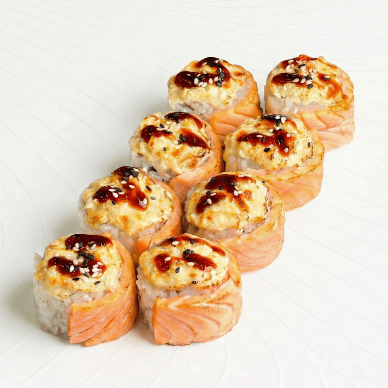 Лосось и сливочный сыр, запеченные под фирменной шапочкой и соусом Унаги с кунжутом