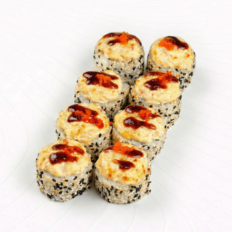 Лосось, сливочный сыр и огурец запеченные под фирменной шапочкой и пряным соусом Поке в дополнении икры масаго, кунжута и зеленого лучка